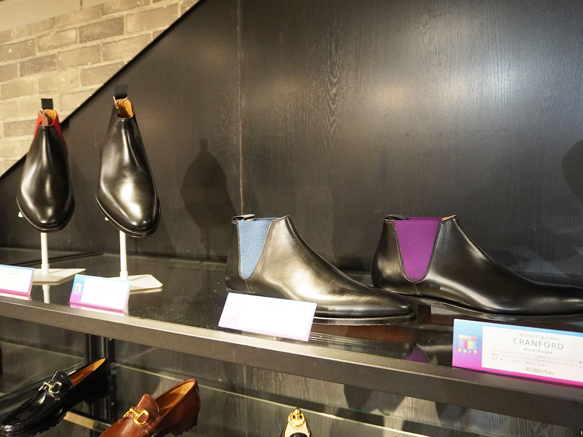 クロケット&ジョーンズは黒に4色のサイドゴア。靴博のカラー(夜の新宿のネオン)に合わせた色展開です。一番左のサイドゴアはゴア部分が赤です。