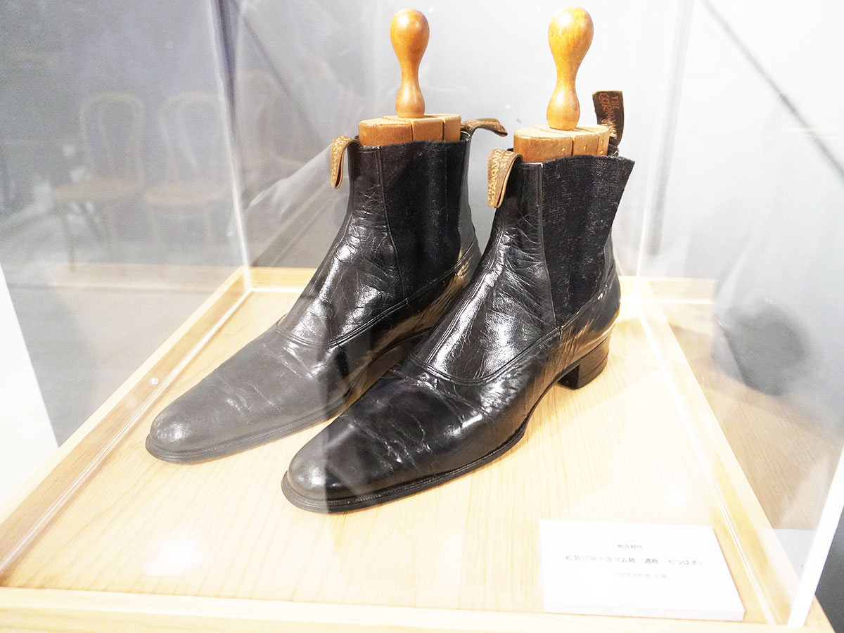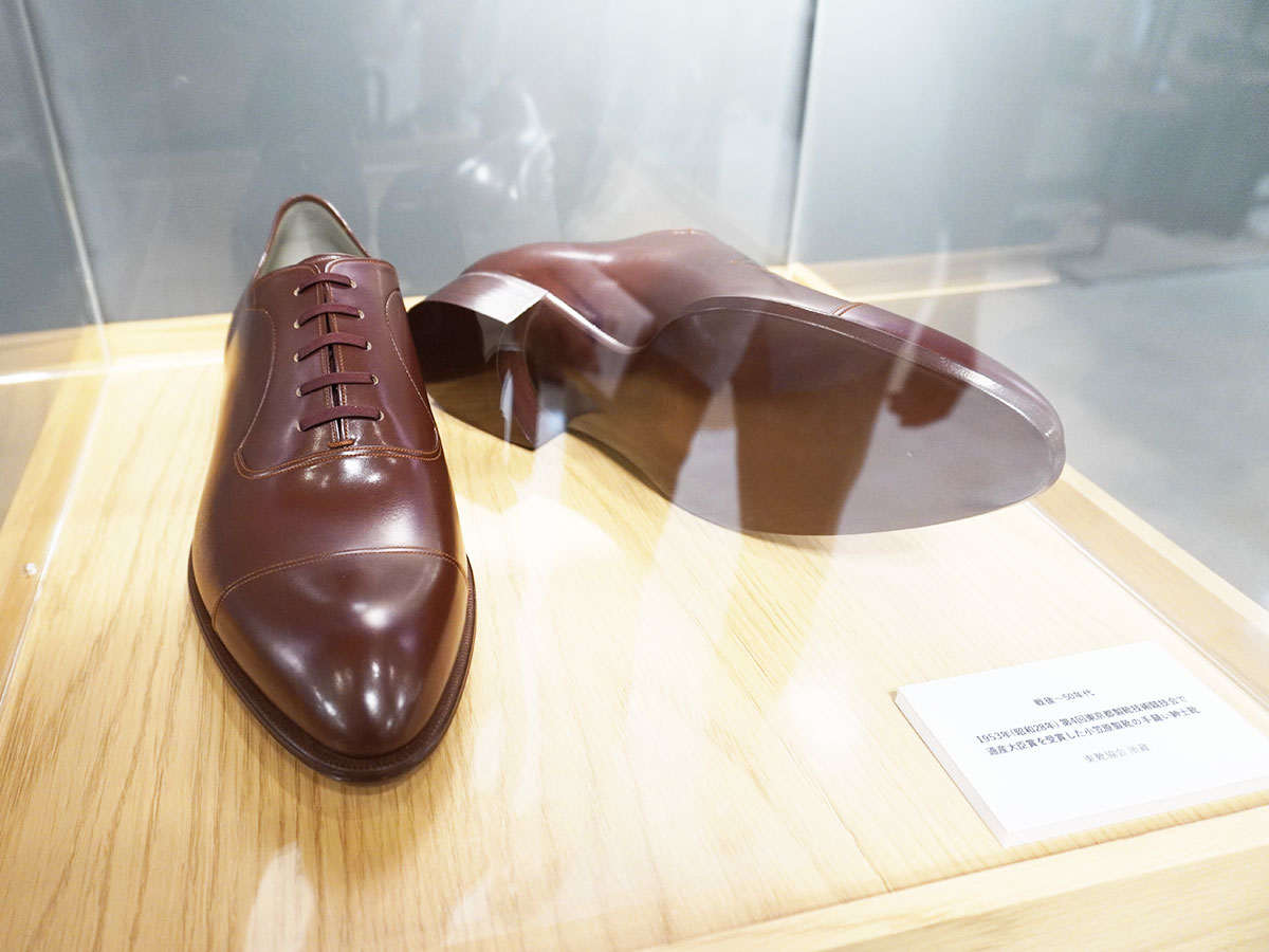 入り口から左に進んだ壁面に日本の革靴150年の歴史が展示されています。