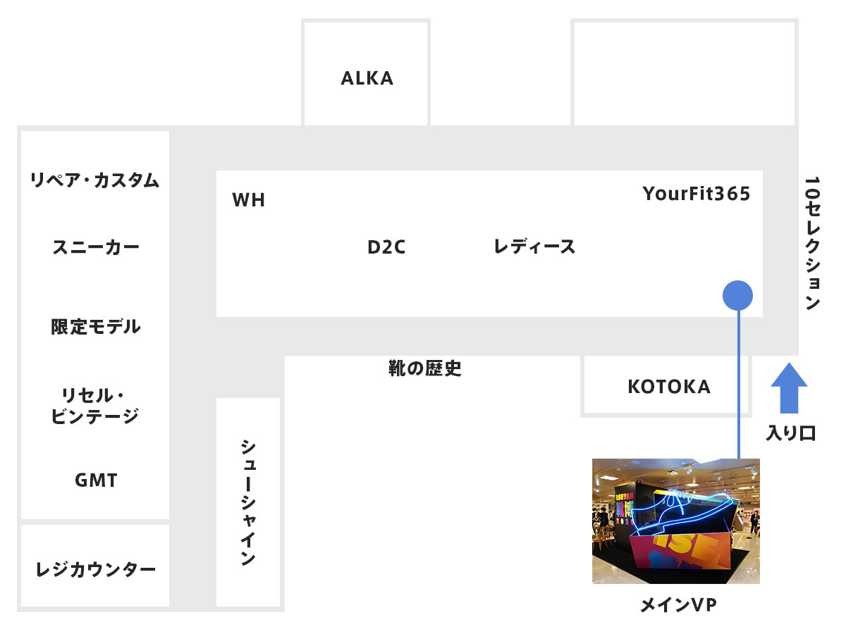 僕もバーっとまわったので写真がイマイチなものもありますが、この夜の新宿を意識した(知らんけど)メインのビジュアルはめちゃめちゃ映えててイケてました。この大きな靴箱の中に入って写真を撮りたい気持ちを抑えて、まずはとりあえずこのビジュアルを右手にまっすぐ奥に進んでください。