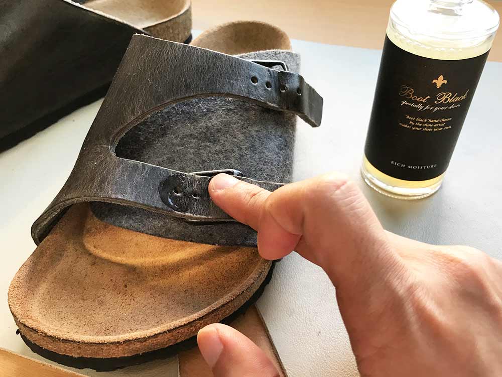 そもそも革にシワがつきにくいデザインなのと、革が厚いので過度に心配する必要はないサンダルだと思いますが、バックルによる負担がかかる部分やシワのある部分にはしっかり油分を与えて革を柔軟にしておくことで、長持ちさせることができます。
