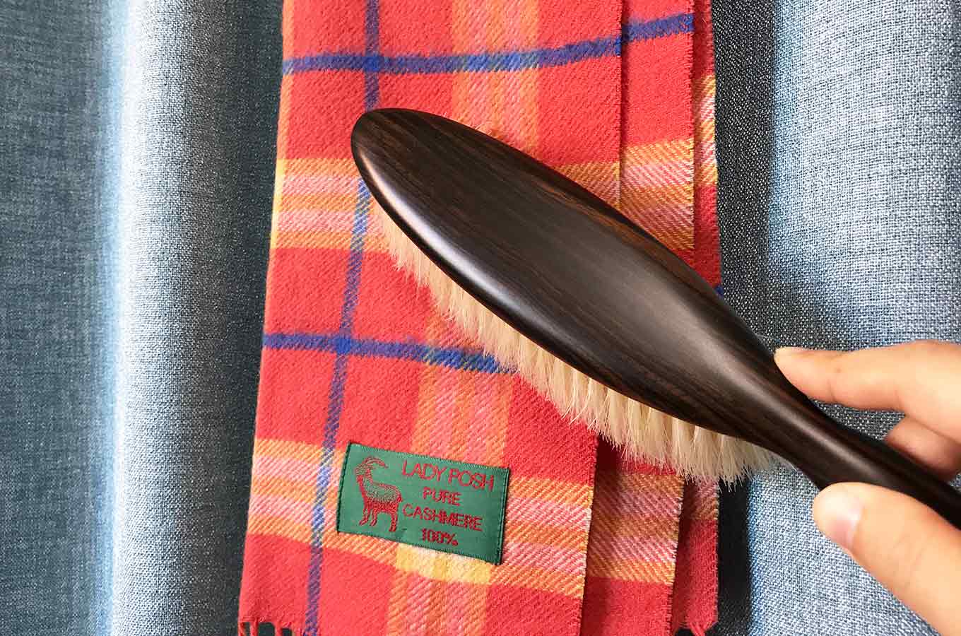 なので、硬い豚毛でガシガシブラッシングをしてしまうと、繊維をいためてしまうこともあるので、最近のデリケートな素材に使うブラシであれば馬毛は間違いない、とのこと。