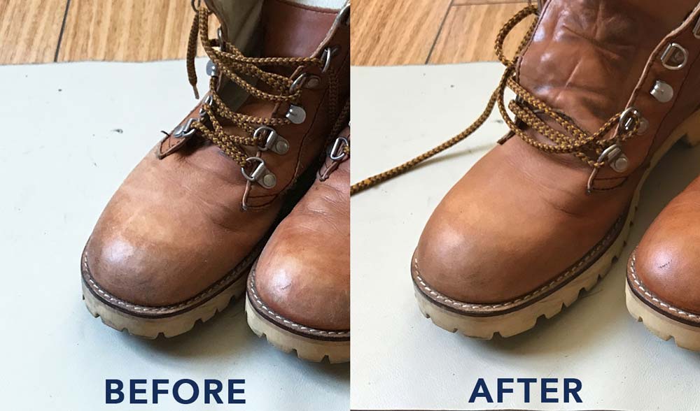 ちょっとだけ残った汚れが『使い込まれたブーツの醍醐味』と言わんばかりの雰囲気を醸し、ユニバーサルレザーローションの塗ったものは『味わい深いレザーの質感と適度なツヤ』だけでなく、しっとりした革の表情がうかがえます。